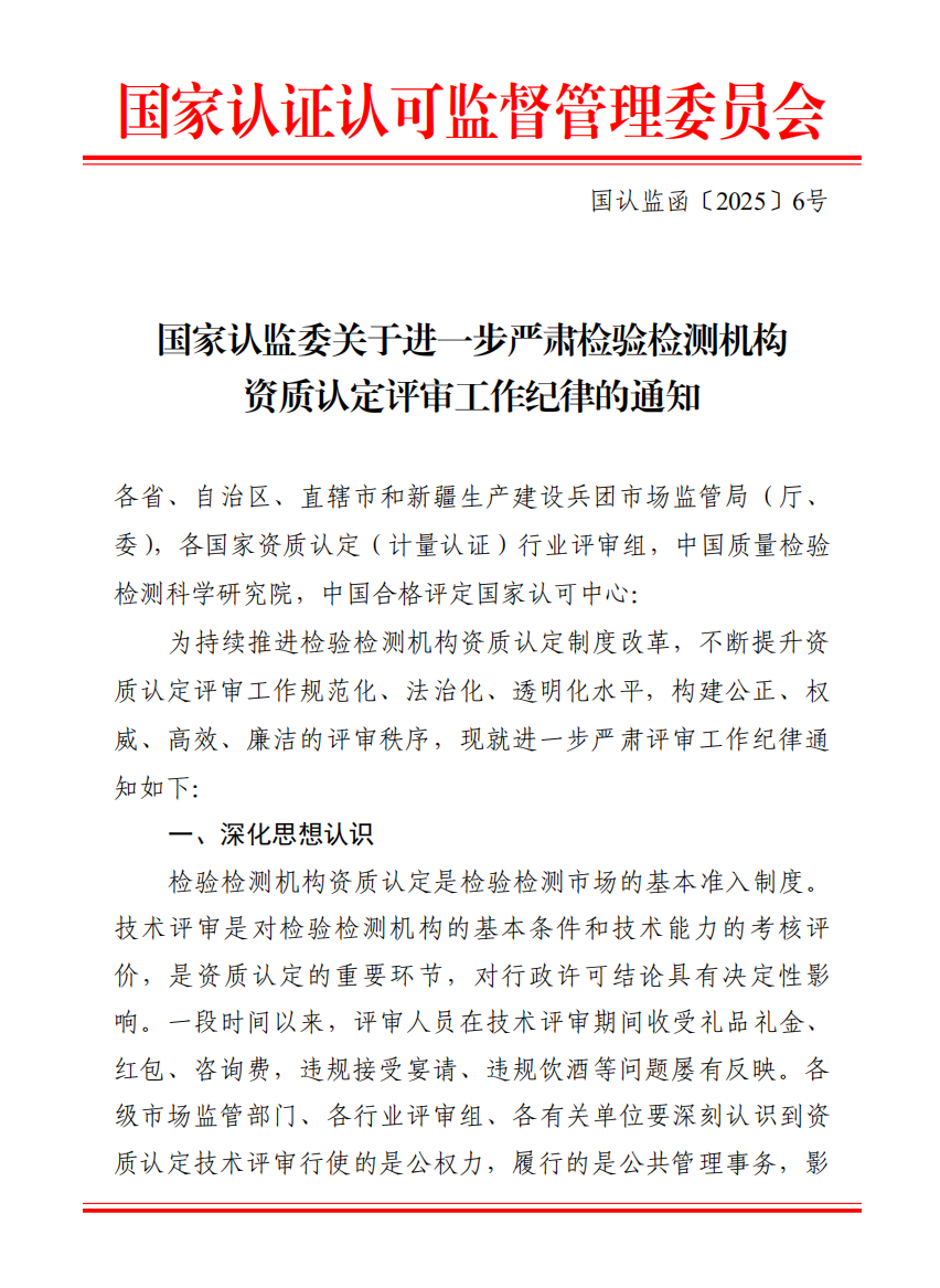 检验检测机构资质认定评审工作纪律迎来最严要求!近日,国家认证认可监督管理委员会(国家认监委)正式发布《关于进一步严肃检验检测机构资质认定评审工作纪律的通知》(国认监函[2025]6号),剑指评审环节的违规违纪行为,明确划出“九个严禁”的红线,旨在构建公正、权威、高效、廉洁的评审秩序。这对规范行业准入、提升评审公信力意义重大,各相关机构及人员务必高度重视!